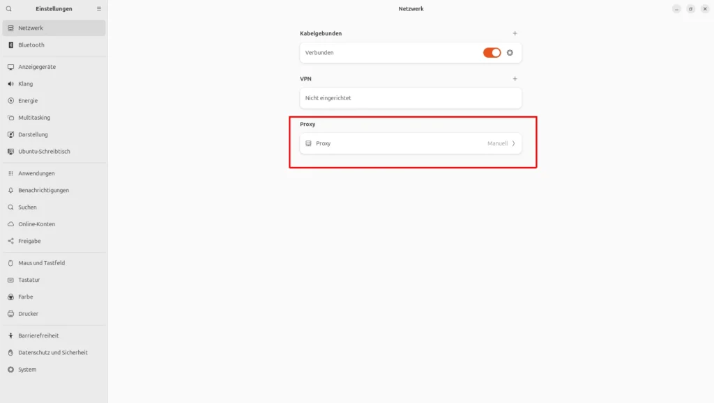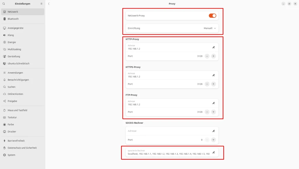 Systemeinstellungen >> Netzwerk >> Proxy >> Manuell